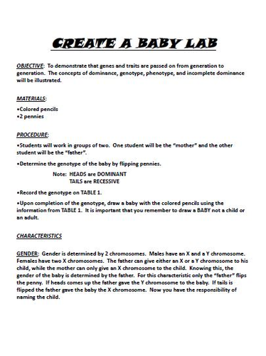 Create-a-Baby Baby Lab by Mandi Jebe. Note that the sex of the baby is determined by dad alone. Create a baby lab answer key.